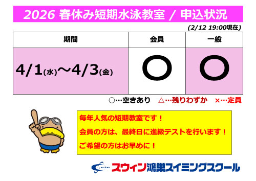 対 象:①スウィン鴻巣会員(スウィンカリキュラム14級以上)