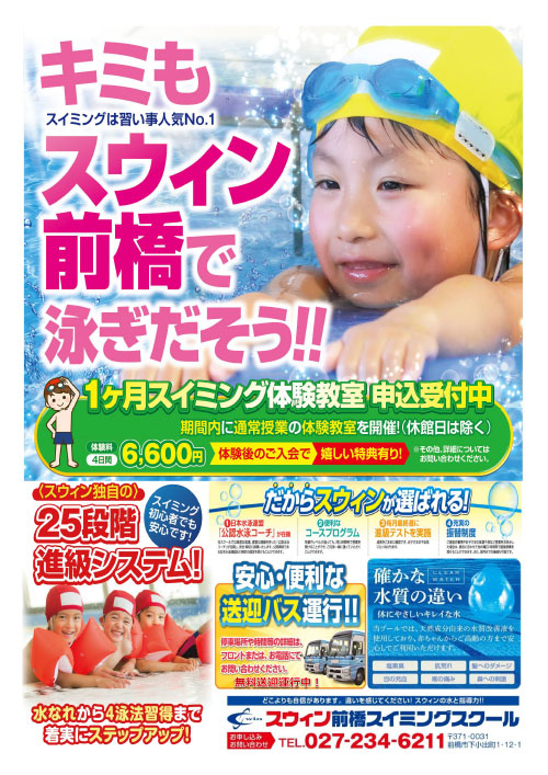 昭和57年6月オープン以来たくさんの地域のみなさまにご愛顧いただき、感謝しております。平成26年4月、スウィン前橋は新しく生まれ変わりました。施設を一新し、より良いサービスの提供に心掛け、引き続き、青少年の健全育成・大人の方の健康増進のお手伝いに精進いたします。