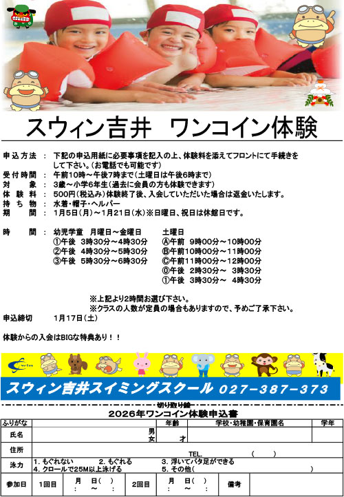 ワンコイン体験参加者募集中!!期間:1月5日(月)~1月21日(水)