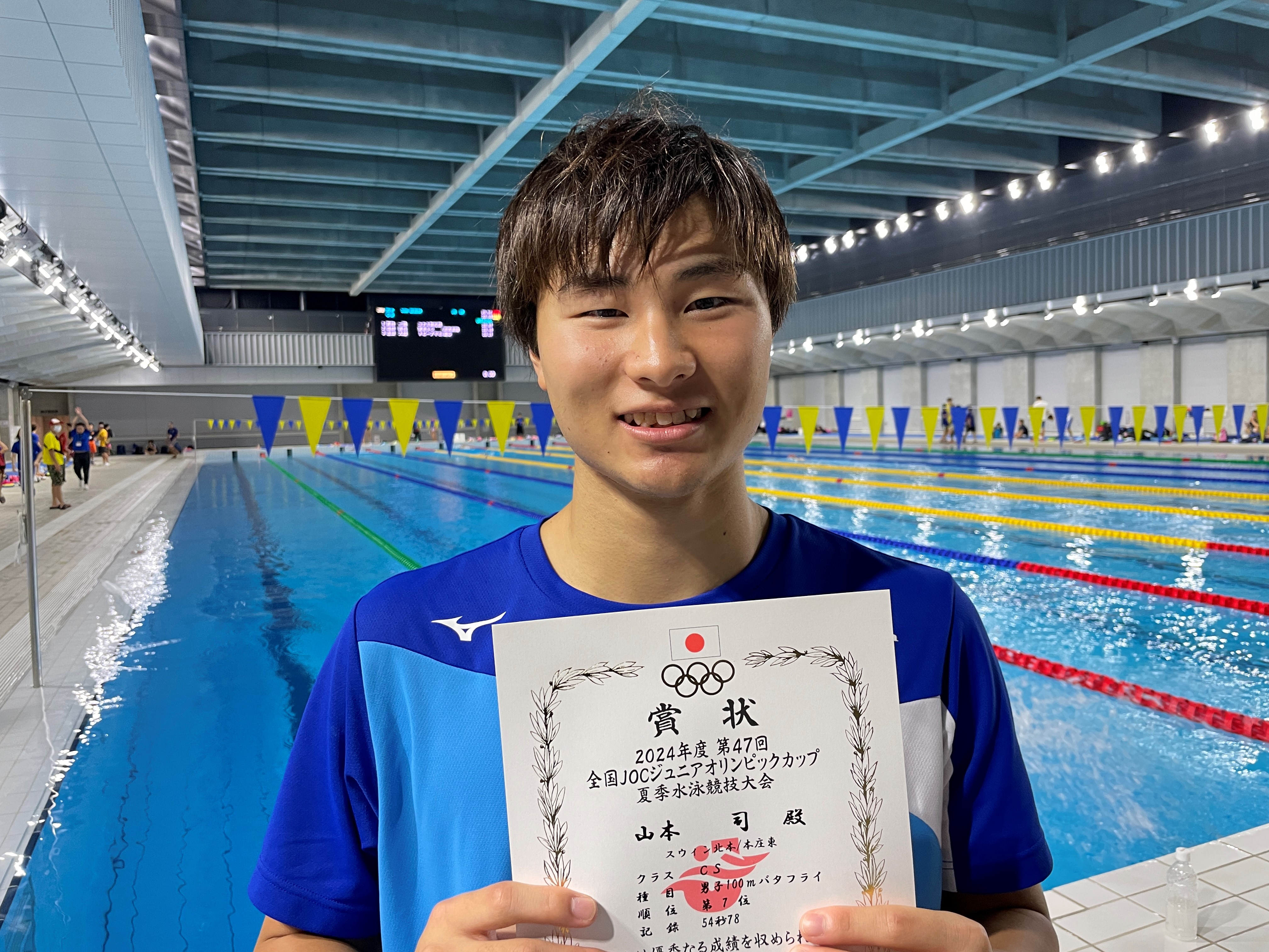 2012年8月26日~30日、東京辰巳国際水泳場で行われた全国JOCジュニアオリンピックカップ夏季大会で100mバタフライに出場した小野川旭選手が見事8位入賞、競合ひしめくCS区分にて健闘しました。
