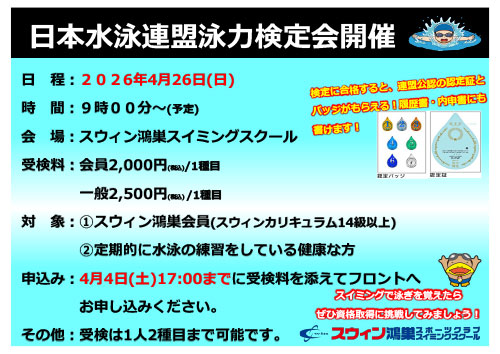 対 象:①スウィン鴻巣会員(スウィンカリキュラム14級以上)