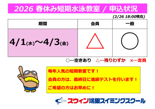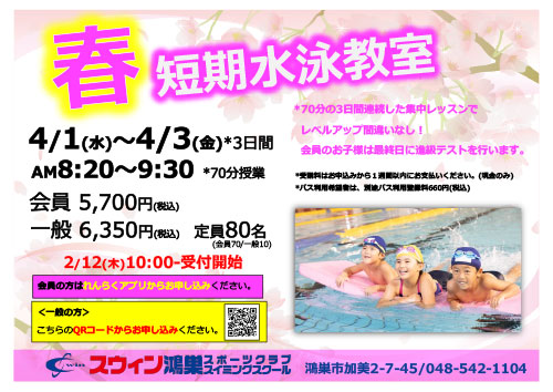 今年も「春休み短期水泳教室」を実施いたします!春休み中の体力アップや、プールが大好きで沢山入りたい等のお子様にオススメです!